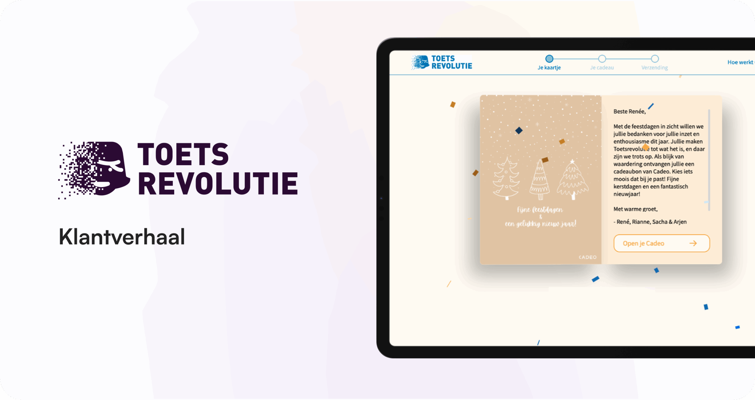 Met Cadeo kon Toetsrevolutie een volledig digitale cadeaucampagne opzetten. Ontvangers kregen een persoonlijke link in huisstijl van het bedrijf, met een persoonlijke berichtje waarmee ze zelf een keuze konden maken uit een breed aanbod van cadeaus. Het resultaat: